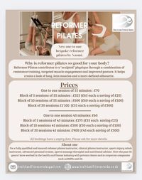 Clinical pilates instructor - Clinical pilates is an approach developed by physiotherapists for managing back pain and other musculoskeletal conditions. It has been proven to be effective in reducing the symptoms and disabilities of these conditions. I teach classes, one to one and partner sessions. I am also training in reformer pilates at the moment and will be able to offer one to one sessions soon!
